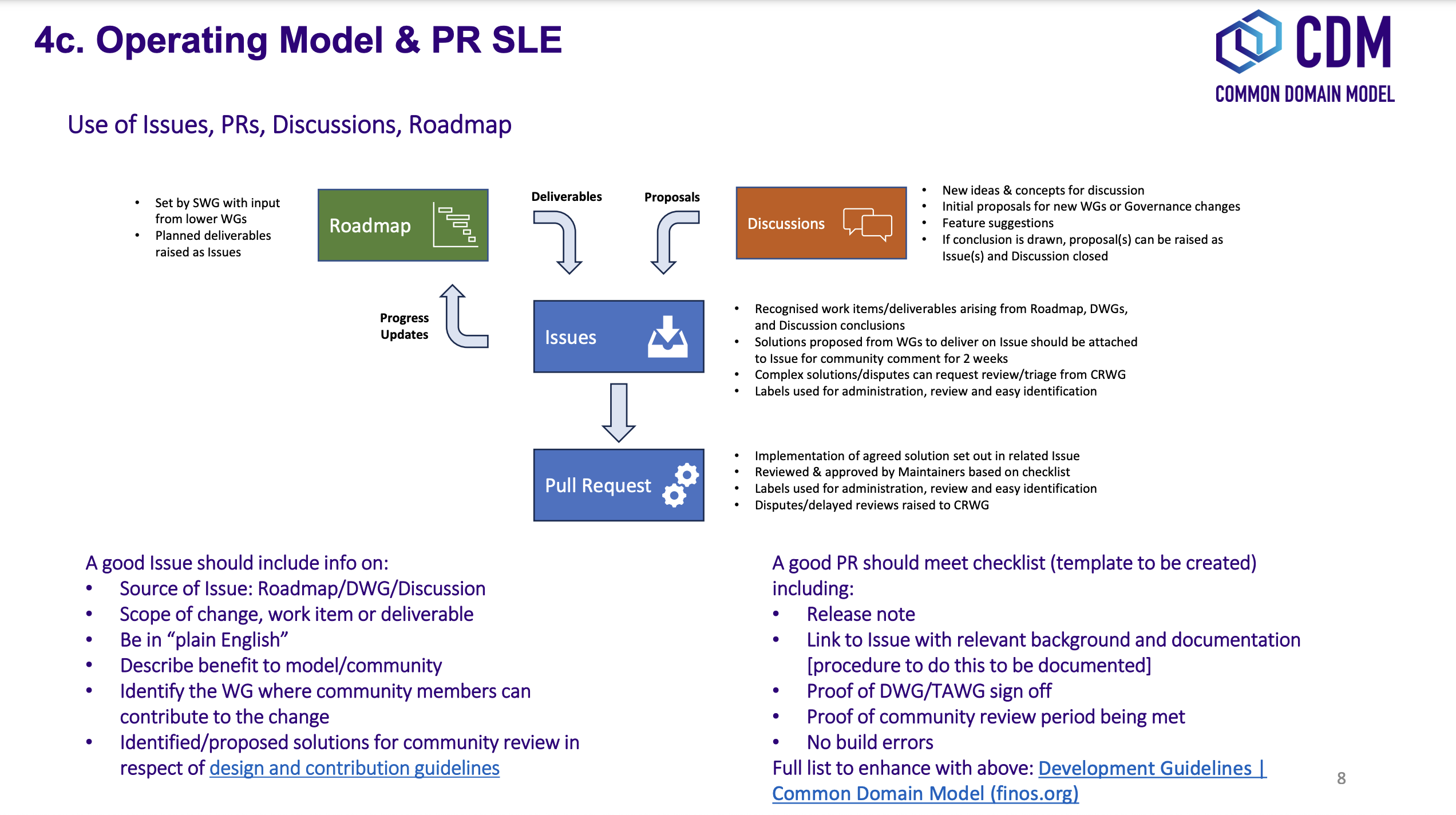 In addition, for large model changes or changes to core data types, it is recommended that the Contributor reviews the agile development approach and follows these steps: